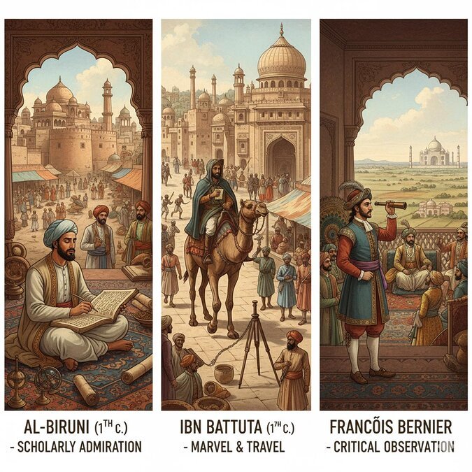Illustration of three historical travellers—Al-Biruni, Ibn Battuta, and François Bernier—observing 11th to 17th century India, showing urban life, marketplaces, traditional architecture, social hierarchies, and cultural diversity from their unique perspectives.